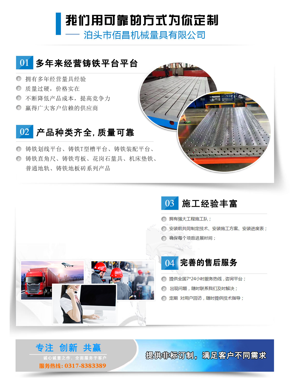 鑄鐵平板平臺系列鑄鐵地板系列大型機(jī)床鑄件系列三維柔性焊接平臺系列機(jī)床墊鐵系列地軌系列鑄鐵彎板系列鑄鐵方箱方筒系列鑄鐵V型架系列平尺、方尺系列花崗石大理石系列偏擺儀系列配重鐵系列特種扳手系列防爆工具系列量規(guī)系列建筑建材爬梯系列其他量具系列
